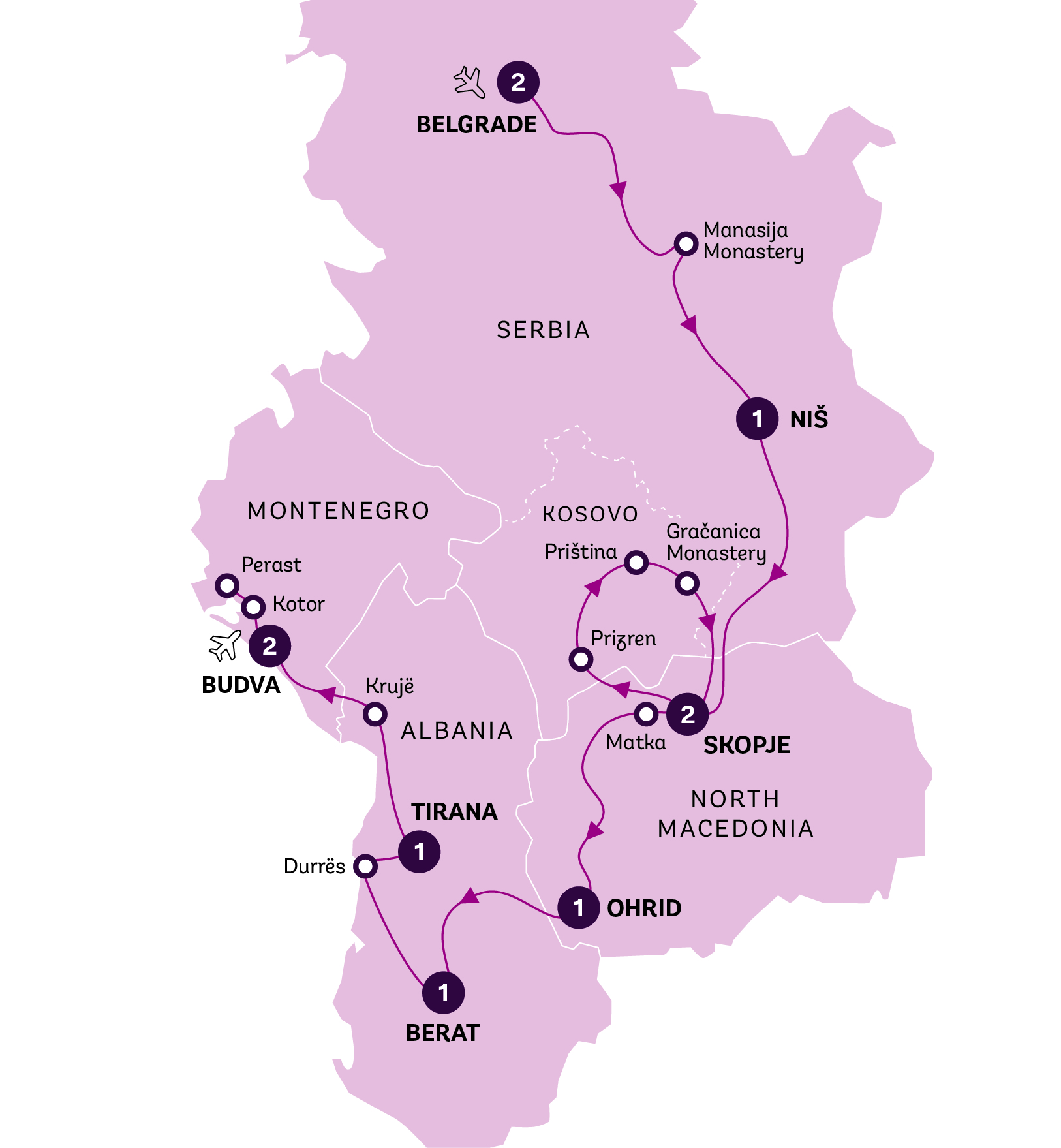 Temple of Saint Sava, Resava Cave, Lisine Waterfalls, Skull Tower, Mediana, Gračanica Monastery, Matka Canyon Boat ride, Black Drim boat ride, St. Naum Monastery, Krujë Castle, Kotor Old Town